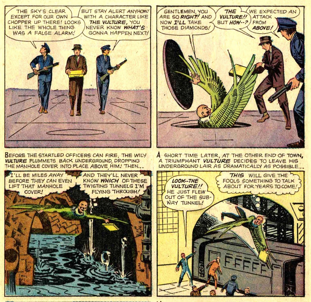 Peter finds a solution to his aunt's financial problems in this issue, which also introduces the first of the major villains in Spiderman's rogue's gallery: The Vulture. As you can see from the cover above, he falls into the category of villains who facially resemble the animal after which they're named. Some others Silver Age examples include the Shark, a Green Lantern antagonist and the Clock, a Green Arrow baddie.